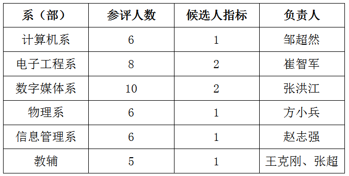 Beat365中文官方网站各系、部按各自参评人数的20%向学院考核考评工作小组推荐候选人,四舍五入,具体分配名额及负责人见下表。