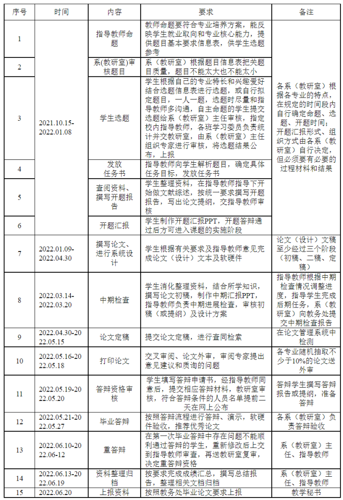毕业论文(设计)是本科教学最重要的实践教学环节,Beat365中文官方网站2022届本科毕业论文(设计)的各项工作将在2021年10月~2022年6月期间完成,为更好地开展这一极为重要的实践环节,按照《Beat365中文官方网站本科生毕业论文工作流程》要求,现就2022届毕业论文(设计)相关工作布置如下,请各系(教研室)仔细阅读并认真执行。