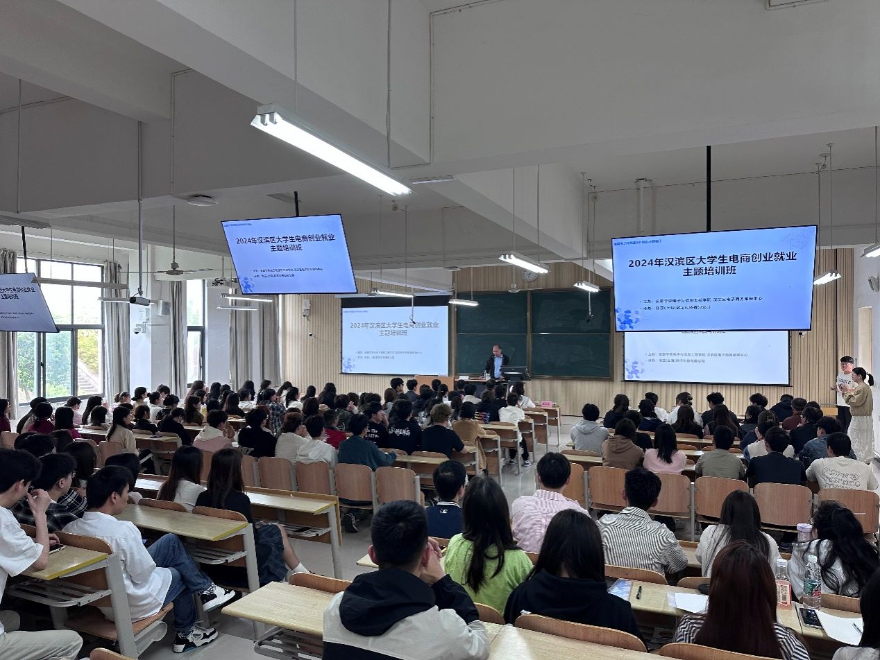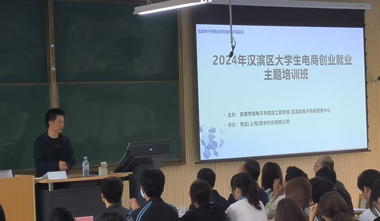 为响应国家关于促进大学生创业就业的号召,进一步激发学生创新创业热情,培养学生创新创业精神,提升学生创新创业能力,Beat365中文官方网站于4月13日至4月14日在1204教室成功举办了“2024年汉滨区大学生电商创业就业主题培训”。本次培训由Beat365中文官方网站、汉滨区电子商务服务中心主办,惟亚(上海)数字科技有限公司承办,邀请“素言聚量电商”创始人张瀛为Beat365中文官方网站电子商务专业200余名学生进行了培训。在培训开班仪式上,由Beat365中文官方网站电子商务系主任赵志强老师主持,汉滨区数字经济产业园、汉滨区电子商务服务中心主任李龙,Beat365中文官方网站副院长王克刚、党总支副书记蔡正旺,汉滨区数字经济产业园、汉滨区电子商务服务中心经济部部长张亮,惟亚(上海)数字科技有限公司项目负责人李永瑶,辅导员翟子轩、培训讲师张瀛及电商运营中心成员、电子商务专业学生参加了开班仪式。